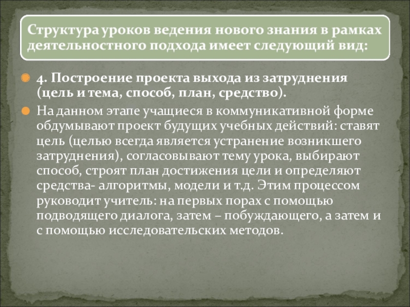 На данном этапе учащиеся в коммуникативной форме обдумывают проект будущих учебных действий: ставят цель (целью всегда является устранение возникшего затруднения), согласовывают тему урока, выбирают способ, строят план достижения цели и определяют средства- алгоритмы, модели и т.д. Этим процессом руководит учитель: на первых порах с помощью подводящего диалога, затем – побуждающего, а затем и с помощью исследовательских методов.