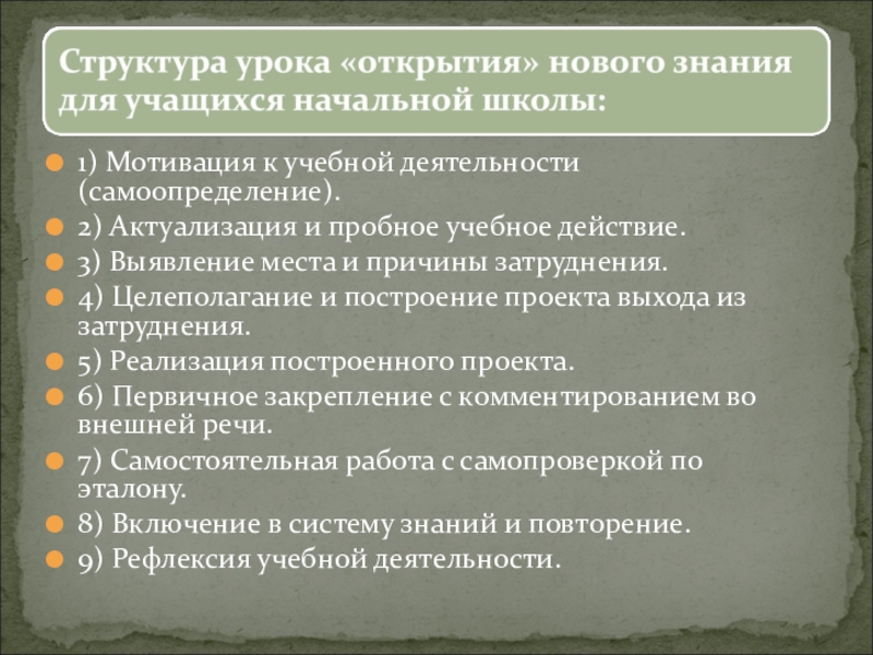 1) актуализацию изученных способов действий, достаточных для построения нового знания, их обобщение и знаковую фиксацию;