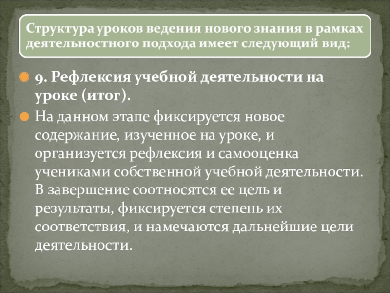 содержание, изученное на уроке, и организуется рефлексия и самооценка учениками собственной учебной деятельности. В завершение соотносятся ее цель и результаты, фиксируется степень их соответствия, и намечаются дальнейшие цели деятельности.