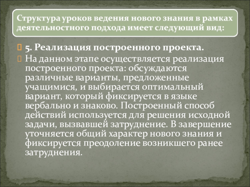 различные варианты, предложенные учащимися, и выбирается оптимальный вариант, который фиксируется в языке вербально и знаково. Построенный способ действий используется для решения исходной задачи, вызвавшей затруднение. В завершение уточняется общий характер нового знания и фиксируется преодоление возникшего ранее затруднения.