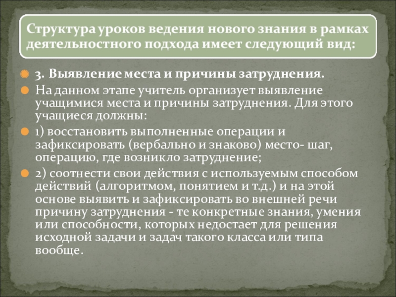2) соотнести свои действия с используемым способом действий (алгоритмом, понятием и т.д.) и на этой основе выявить и зафиксировать во внешней речи причину затруднения - те конкретные знания, умения или способности, которых недостает для решения исходной задачи и задач такого класса или типа вообще.