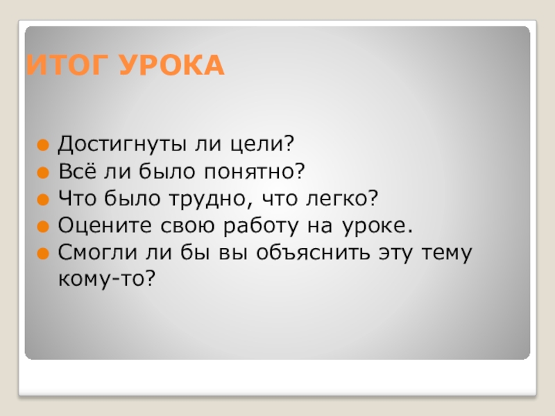ИТОГ УРОКАДостигнуты ли цели?Всё ли было понятно?Что было трудно, что легко?Оцените свою работу на уроке.Смогли ли бы