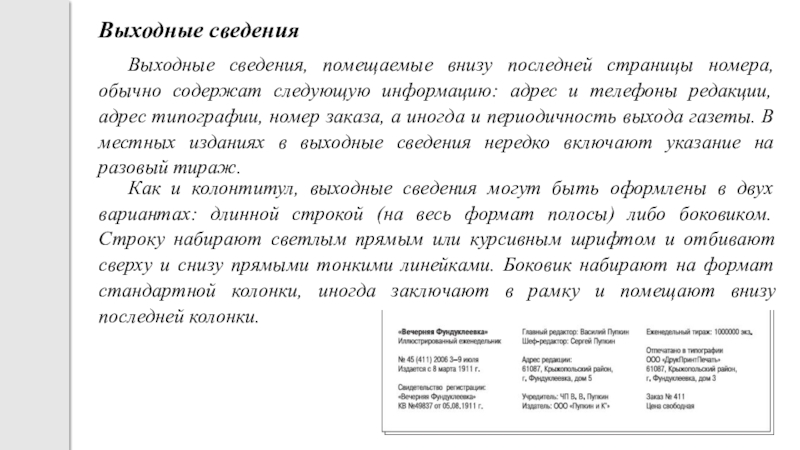 Как и колонтитул, выходные сведения могут быть оформлены в двух вариантах: длинной строкой (на весь формат полосы) либо боковиком. Строку набирают светлым прямым или курсивным шрифтом и отбивают сверху и снизу прямыми тонкими линейками. Боковик набирают на формат стандартной колонки, иногда заключают в рамку и помещают внизу последней колонки.