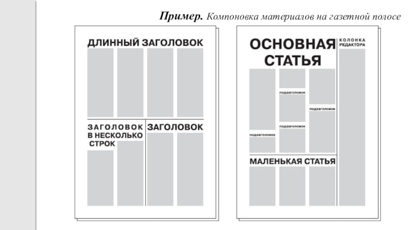 Слайд 14Пример. Компоновка материалов на газетной полосе