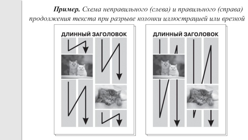 Слайд 21Пример. Схема неправильного (слева) и правильного (справа) продолжения текста при разрыве