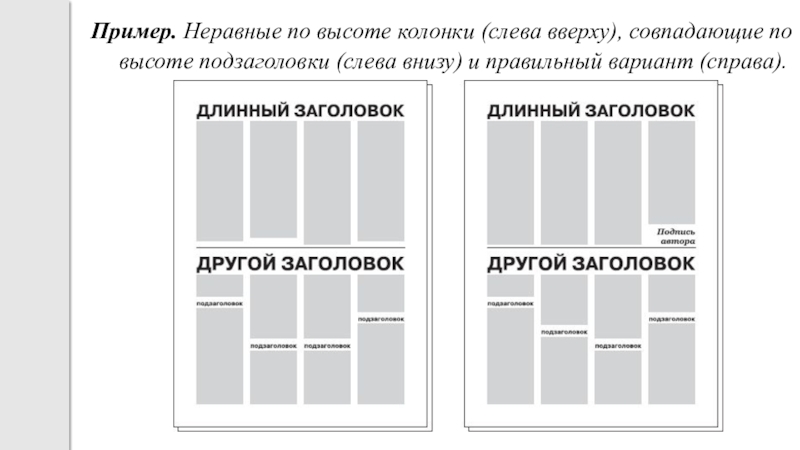 Слайд 16Пример. Неравные по высоте колонки (слева вверху), совпадающие по высоте подзаголовки