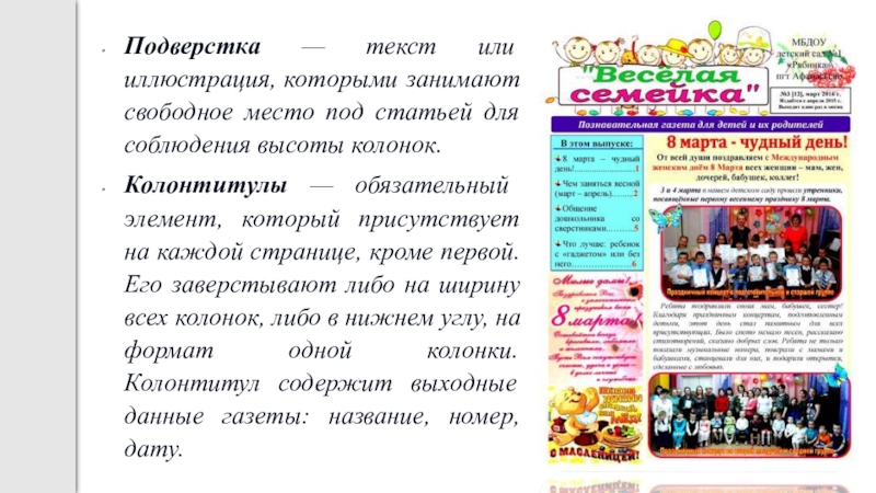 Слайд 10Подверстка — текст или иллюстрация, которыми занимают свободное место под статьей