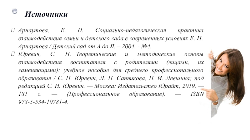 Юревич, С. Н. Теоретические и методические основы взаимодействия воспитателя с родителями (лицами, их заменяющими): учебное пособие для среднего профессионального образования / С. Н. Юревич, Л. Н. Санникова, Н. И. Левшина; под редакцией С. Н. Юревич. — Москва: Издательство Юрайт, 2019. — 181 с. — (Профессиональное образование). — ISBN 978-5-534-10781-4.