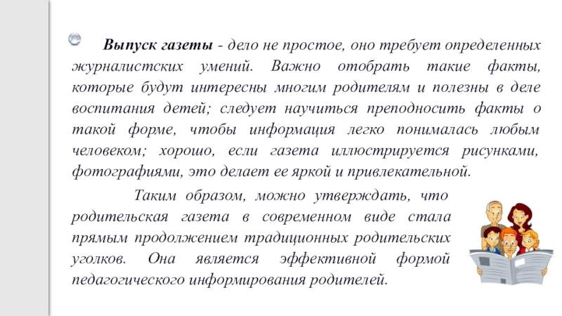 требует определенных журналистских умений. Важно отобрать такие факты, которые будут интересны многим родителям и полезны в деле воспитания детей; следует научиться преподносить факты о такой форме, чтобы информация легко понималась любым человеком; хорошо, если газета иллюстрируется рисунками, фотографиями, это делает ее яркой и привлекательной.