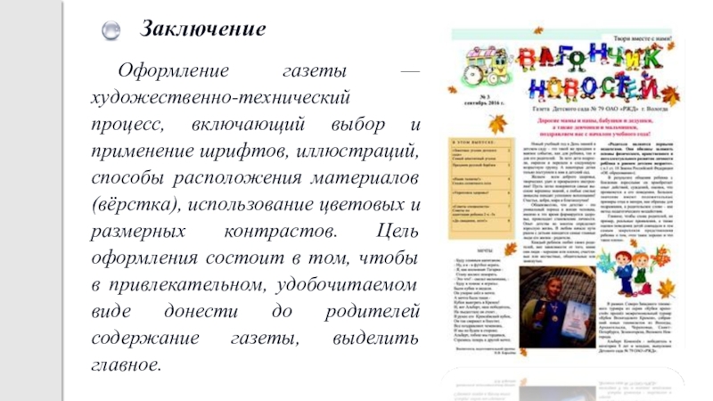 способы расположения материалов (вёрстка), использование цветовых и размерных контрастов. Цель оформления состоит в том, чтобы в привлекательном, удобочитаемом виде донести до родителей содержание газеты, выделить главное.