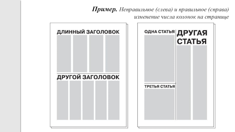 Слайд 15Пример. Неправильное (слева) и правильное (справа) изменение числа колонок на странице