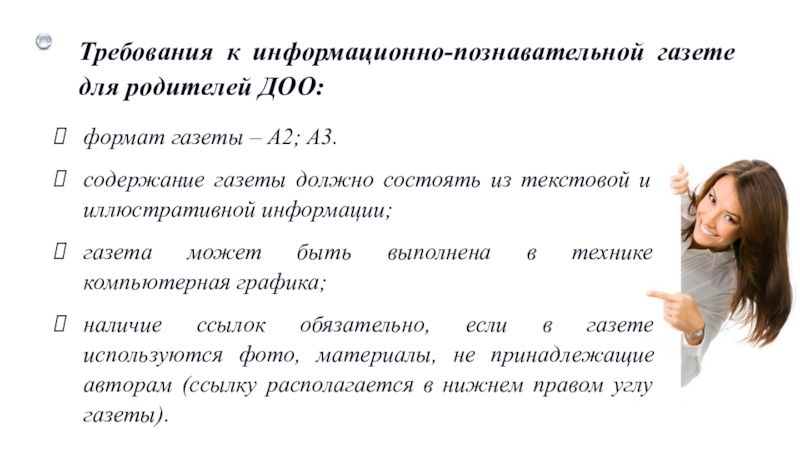 Слайд 26Требования к информационно-познавательной газете для родителей ДОО: