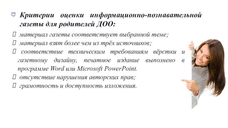 Слайд 27Критерии оценки информационно-познавательной газеты для родителей ДОО: