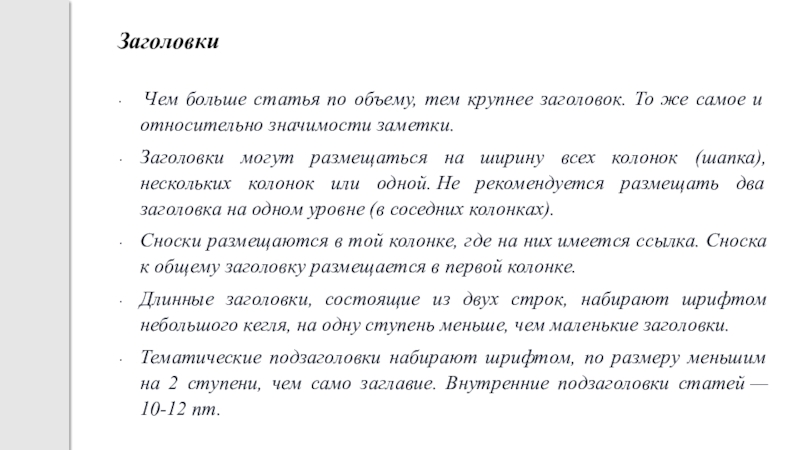 Тематические подзаголовки набирают шрифтом, по размеру меньшим на 2 ступени, чем само заглавие. Внутренние подзаголовки статей — 10-12 пт.