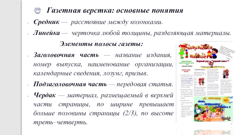 Слайд 8Газетная верстка: основные понятия