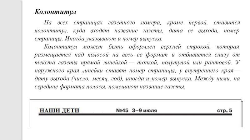 Колонтитул может быть оформлен верхней строкой, которая размещается над полосой на весь ее формат и отбивается снизу от текста газеты прямой линейкой — тонкой, полутупой или рантовой. У наружного края линейки ставят номер страницы, у внутреннего края — дату выхода (число, месяц, год), иногда и номер выпуска. Между ними, на середине формата полосы, помещают название газеты.