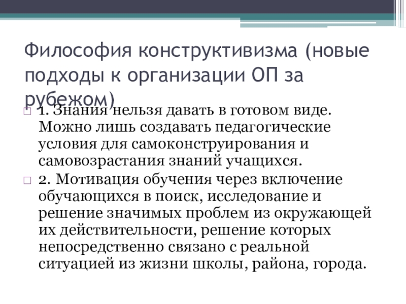 Слайд 12Философия конструктивизма (новые подходы к организации ОП за рубежом)