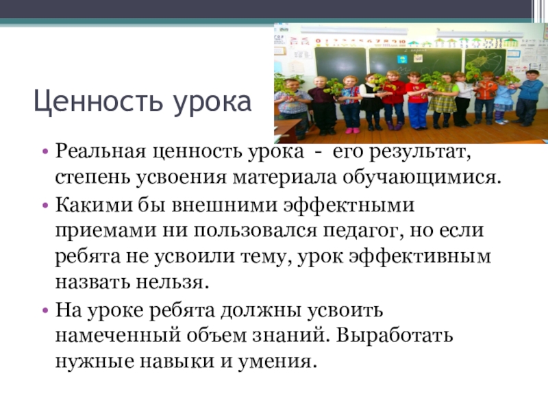 Реальная ценность урока - его результат, степень усвоения материала обучающимися.