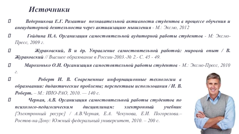 Черная, А.В. Организация самостоятельной работы студентов по психолого-педагогическим дисциплинам: электронный учебник [Электронный ресурс] / А.В.Черная, Е.А. Чекунова, Е.И. Погорелова.– Ростов-на-Дону: Южный федеральный университет, 2010. – 200 с.