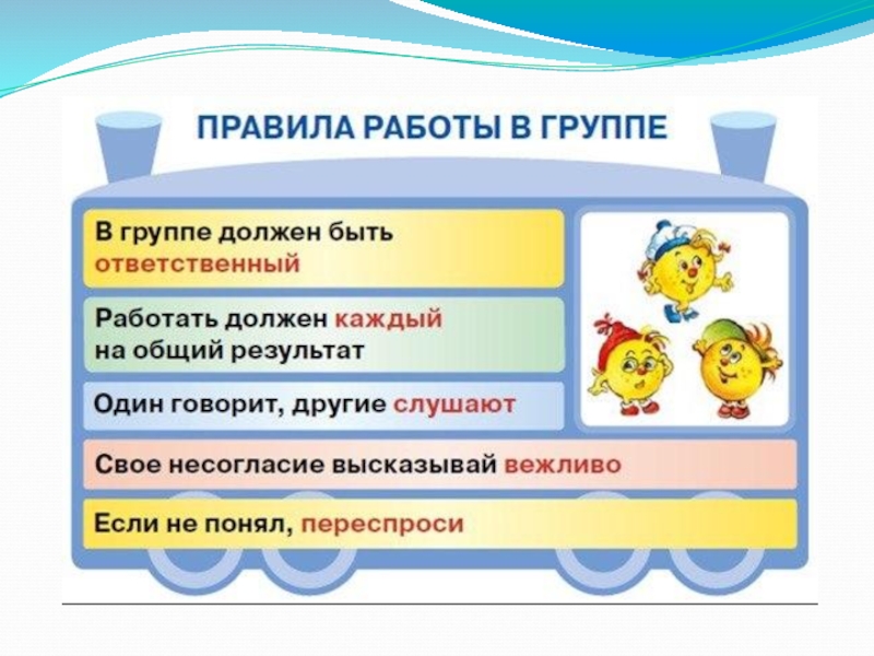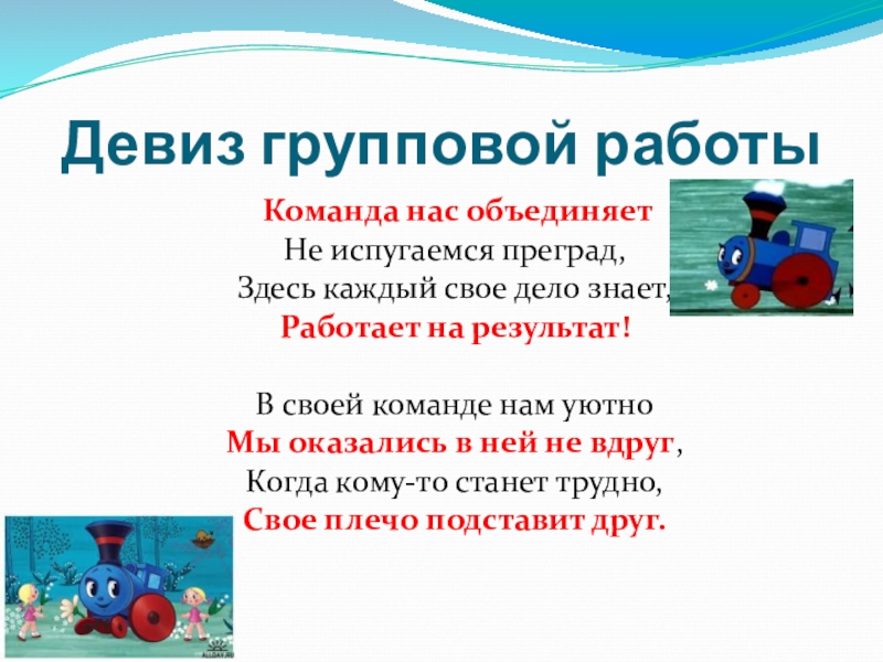 Девиз групповой работы Команда нас объединяет  Не испугаемся преград, Здесь каждый свое дело знает, Работает на результат! В своей команде нам уютно Мы оказались в ней не вдруг, Когда кому-то станет трудно, Свое