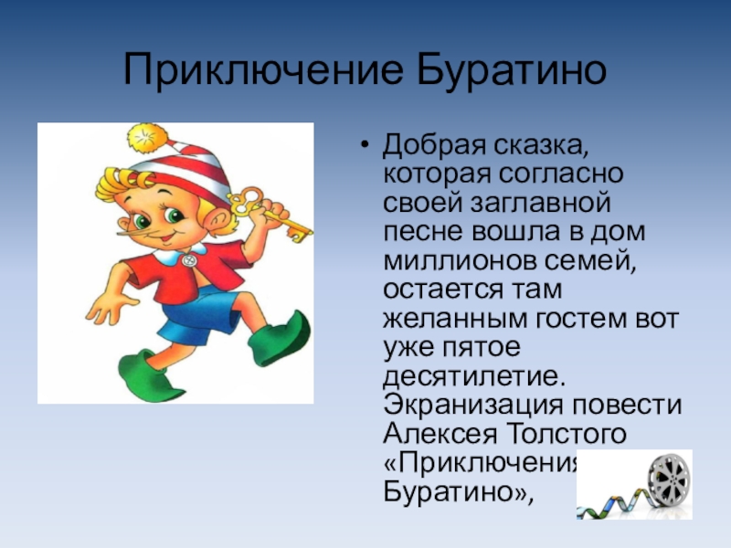 миллионов семей, остается там желанным гостем вот уже пятое десятилетие. Экранизация повести Алексея Толстого «Приключения Буратино»,