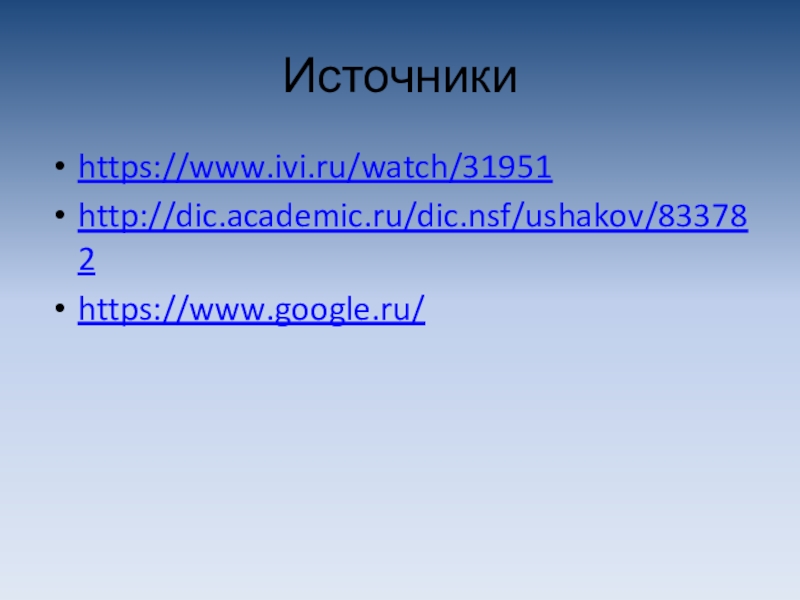 Источникиhttps://www.ivi.ru/watch/31951http://dic.academic.ru/dic.nsf/ushakov/833782https://www.google.ru/