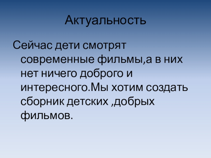 АктуальностьСейчас дети смотрят современные фильмы,а в них нет ничего доброго и интересного.Мы хотим создать сборник детских ,добрых