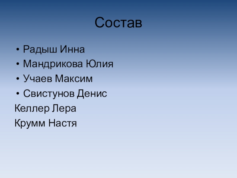СоставРадыш ИннаМандрикова ЮлияУчаев МаксимСвистунов ДенисКеллер ЛераКрумм Настя