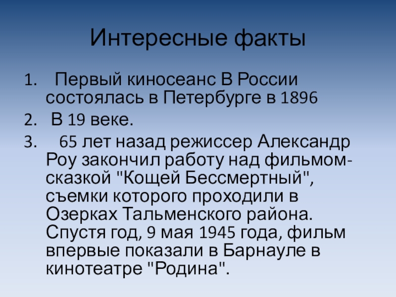 Интересные факты1.  Первый киносеанс В России состоялась в Петербурге в 18962.  В 19 веке.3.