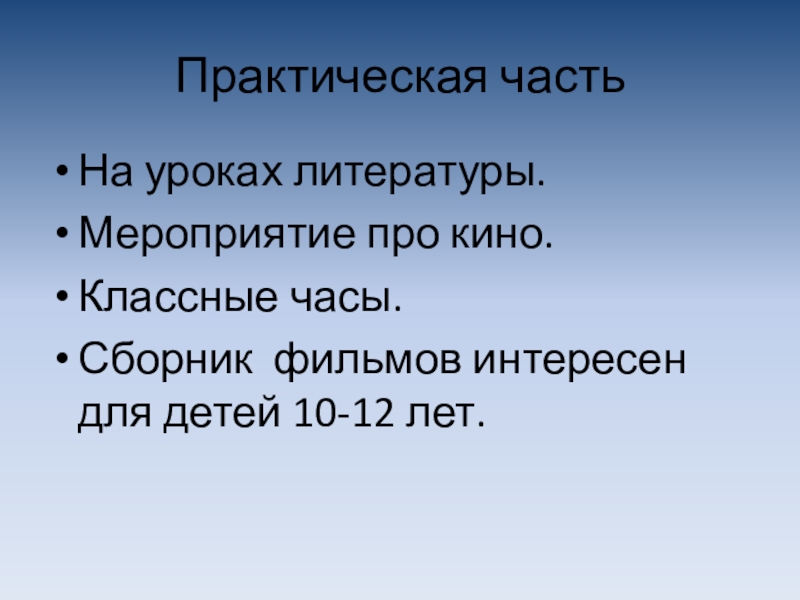 Практическая частьНа уроках литературы.Мероприятие про кино.Классные часы.Сборник фильмов интересен для детей 10-12 лет.