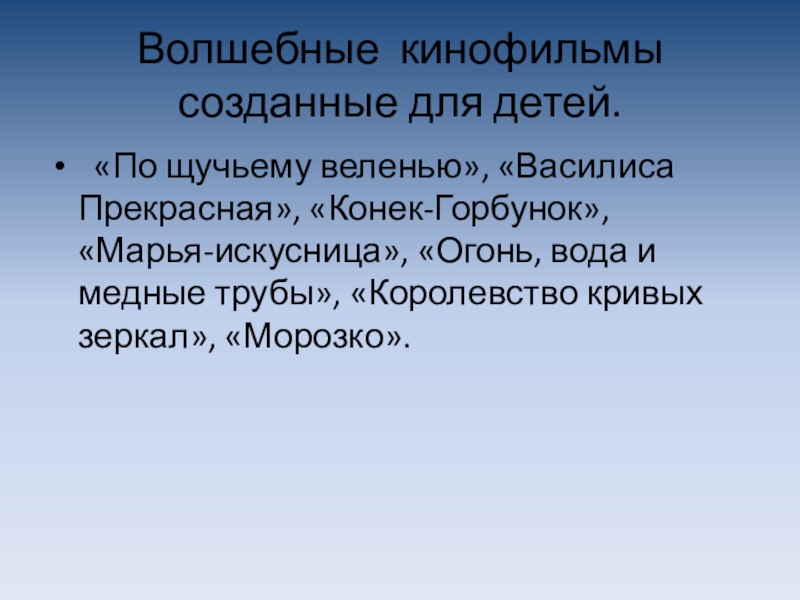Волшебные кинофильмы созданные для детей. «По щучьему веленью», «Василиса Прекрасная», «Конек-Горбунок», «Марья-искусница», «Огонь, вода и медные трубы»,