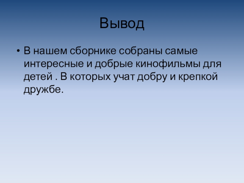 ВыводВ нашем сборнике собраны самые интересные и добрые кинофильмы для детей . В которых учат добру и