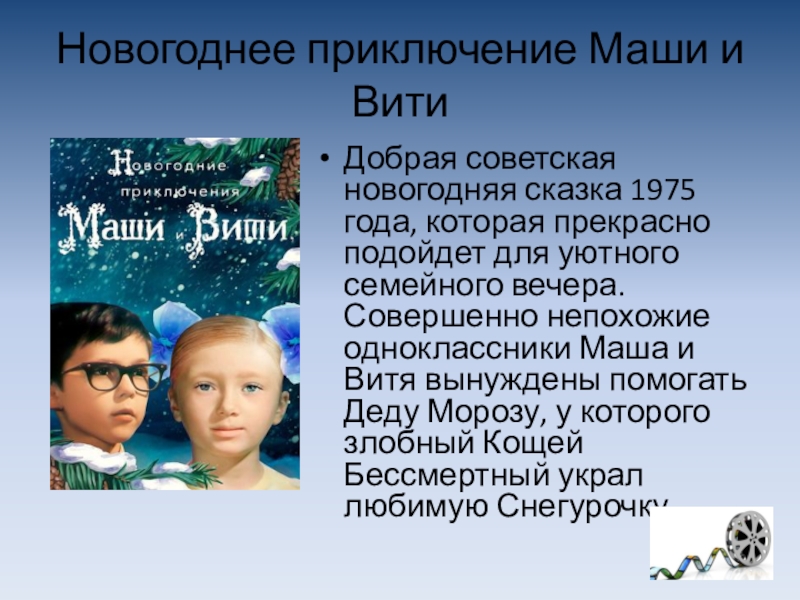 прекрасно подойдет для уютного семейного вечера. Совершенно непохожие одноклассники Маша и Витя вынуждены помогать Деду Морозу, у которого злобный Кощей Бессмертный украл любимую Снегурочку…