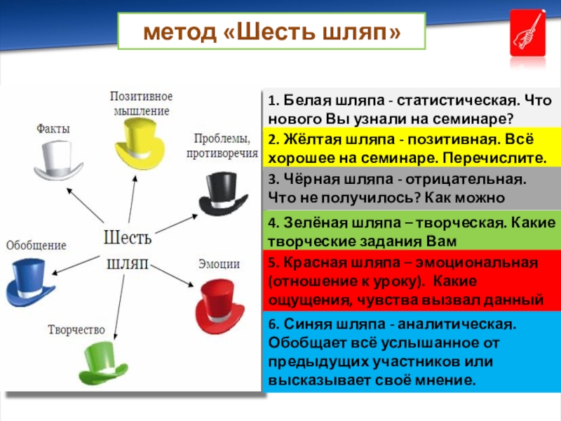 5. Красная шляпа – эмоциональная (отношение к уроку). Какие ощущения, чувства вызвал данный семинар?