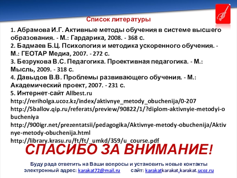 1. Абрамова И.Г. Активные методы обучения в системе высшего образования. - М.: Гардарика, 2008. - 368 с.
