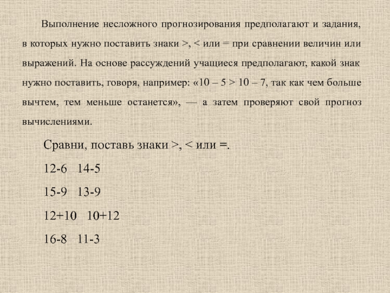 Выполнение несложного прогнозирования предполагают и задания, в которых нужно поставить знаки >, < или = при сравнении величин или выражений. На основе рассуждений учащиеся предполагают, какой знак нужно поставить, говоря, например: «10 – 5 > 10 – 7, так как чем больше вычтем, тем меньше останется», — а затем проверяют свой прогноз вычислениями.