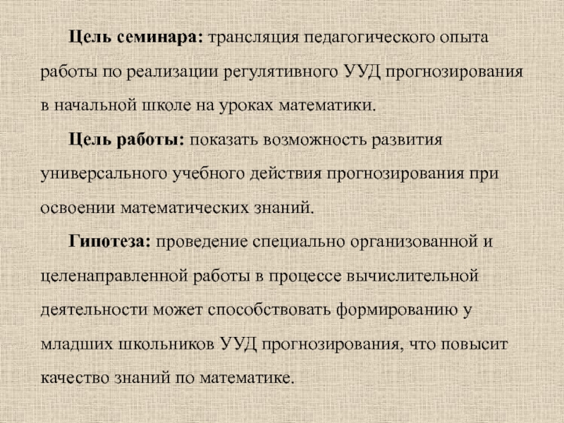 Гипотеза: проведение специально организованной и целенаправленной работы в процессе вычислительной деятельности может способствовать формированию у младших школьников УУД прогнозирования, что повысит качество знаний по математике.