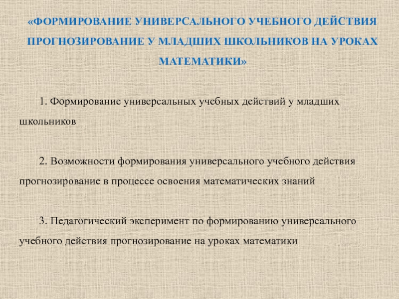 Слайд 5«ФОРМИРОВАНИЕ УНИВЕРСАЛЬНОГО УЧЕБНОГО ДЕЙСТВИЯ ПРОГНОЗИРОВАНИЕ У МЛАДШИХ ШКОЛЬНИКОВ НА УРОКАХ МАТЕМАТИКИ»