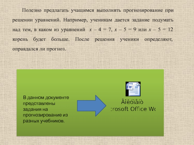 Слайд 12Полезно предлагать учащимся выполнять прогнозирование при решении уравнений. Например, ученикам дается