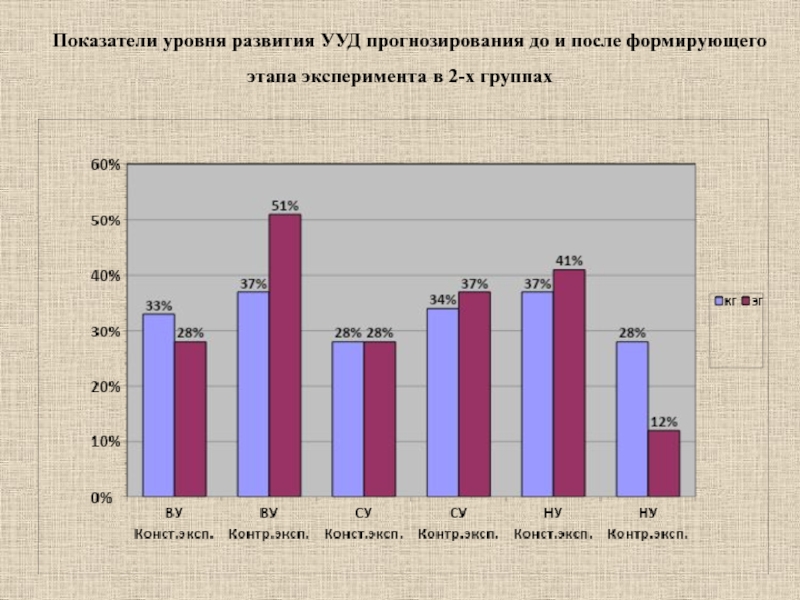 Слайд 16Показатели уровня развития УУД прогнозирования до и после формирующего этапа эксперимента