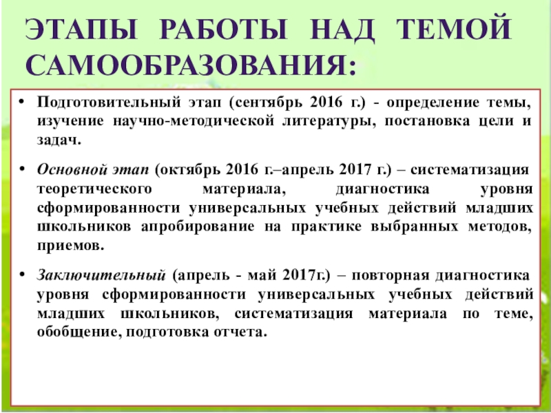 Этапы работы над темой самообразования: