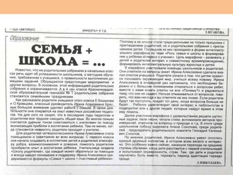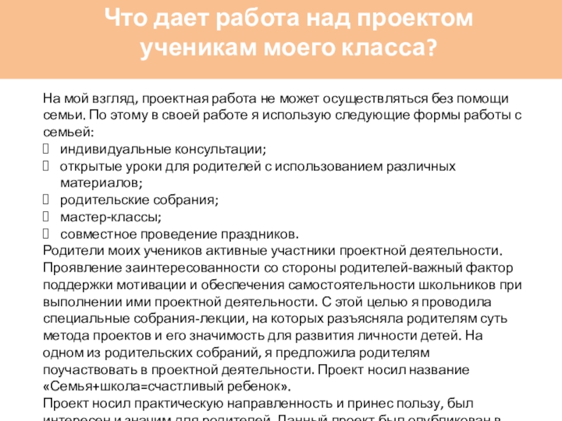 Родители моих учеников активные участники проектной деятельности. Проявление заинтересованности со стороны родителей-важный фактор поддержки мотивации и обеспечения самостоятельности школьников при выполнении ими проектной деятельности. С этой целью я проводила специальные собрания-лекции, на которых разъясняла родителям суть метода проектов и его значимость для развития личности детей. На одном из родительских собраний, я предложила родителям поучаствовать в проектной деятельности. Проект носил название «Семья+школа=счастливый ребенок».