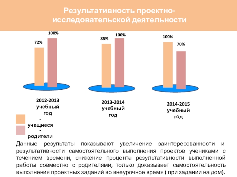 заинтересованности и результативности самостоятельного выполнения проектов учениками с течением времени, снижение процента результативности выполненной работы совместно с родителями, только доказывает самостоятельность выполнения проектных заданий во внеурочное время ( при задании на дом).