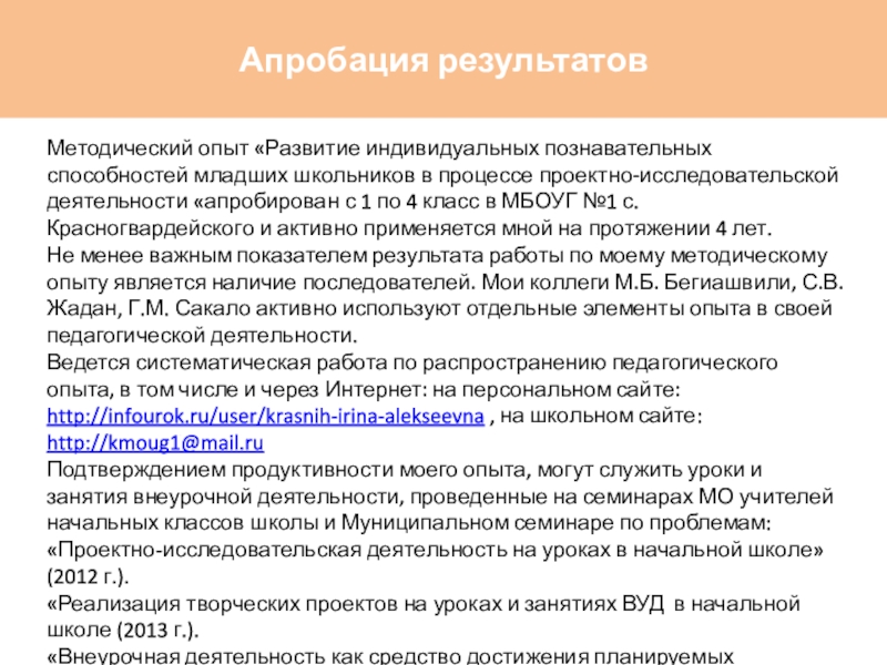 Ведется систематическая работа по распространению педагогического опыта, в том числе и через Интернет: на персональном сайте: http://infourok.ru/user/krasnih-irina-alekseevna , на школьном сайте: http://kmoug1@mail.ru