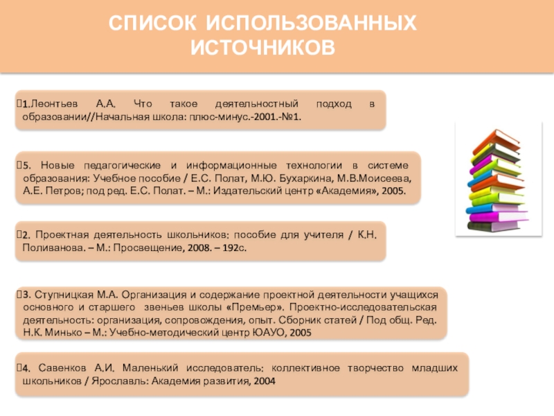 1.Леонтьев А.А. Что такое деятельностный подход в образовании//Начальная школа: плюс-минус.-2001.-№1.