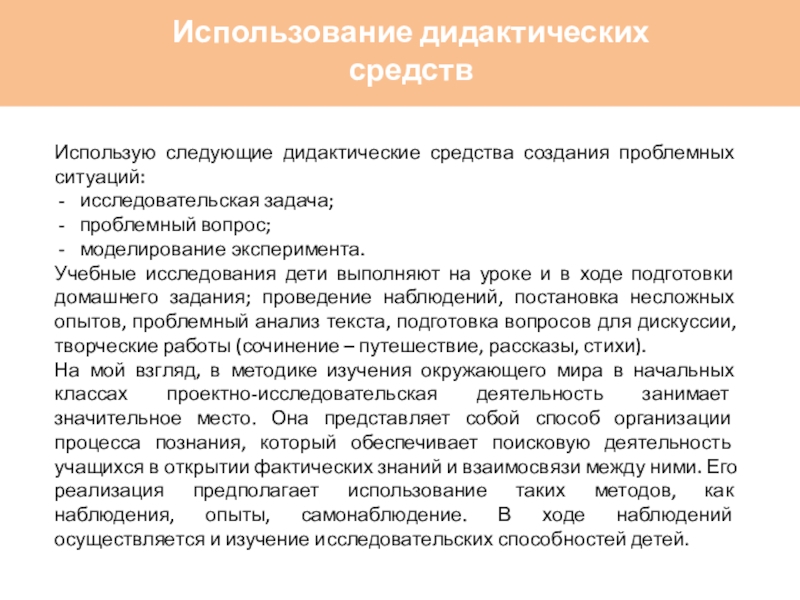 На мой взгляд, в методике изучения окружающего мира в начальных классах проектно-исследовательская деятельность занимает значительное место. Она представляет собой способ организации процесса познания, который обеспечивает поисковую деятельность учащихся в открытии фактических знаний и взаимосвязи между ними. Его реализация предполагает использование таких методов, как наблюдения, опыты, самонаблюдение. В ходе наблюдений осуществляется и изучение исследовательских способностей детей.