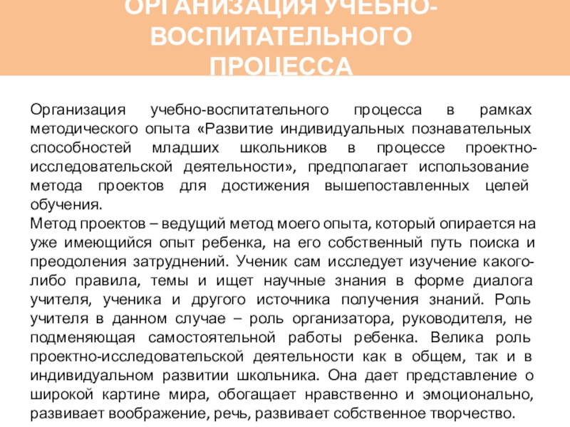 Организация учебно-воспитательного процесса в рамках методического опыта «Развитие индивидуальных