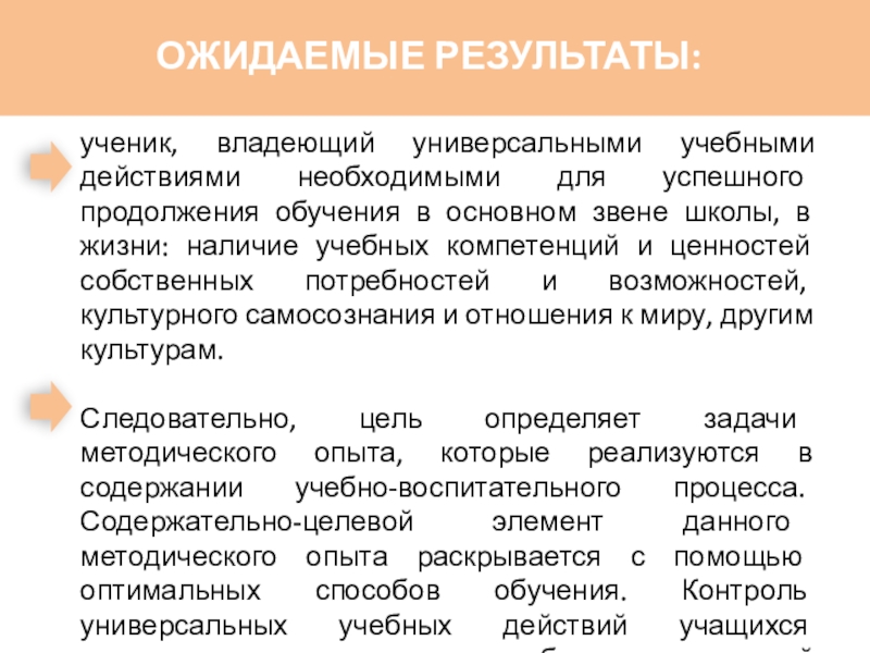 Следовательно, цель определяет задачи методического опыта, которые реализуются в содержании учебно-воспитательного процесса. Содержательно-целевой элемент данного методического опыта раскрывается с помощью оптимальных способов обучения. Контроль универсальных учебных действий учащихся осуществляется во всех видах учебно-познавательной деятельности.