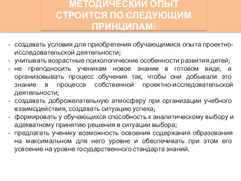 Слайд 11МЕТОДИЧЕСКИЙ ОПЫТ СТРОИТСЯ ПО СЛЕДУЮЩИМ ПРИНЦИПАМ: