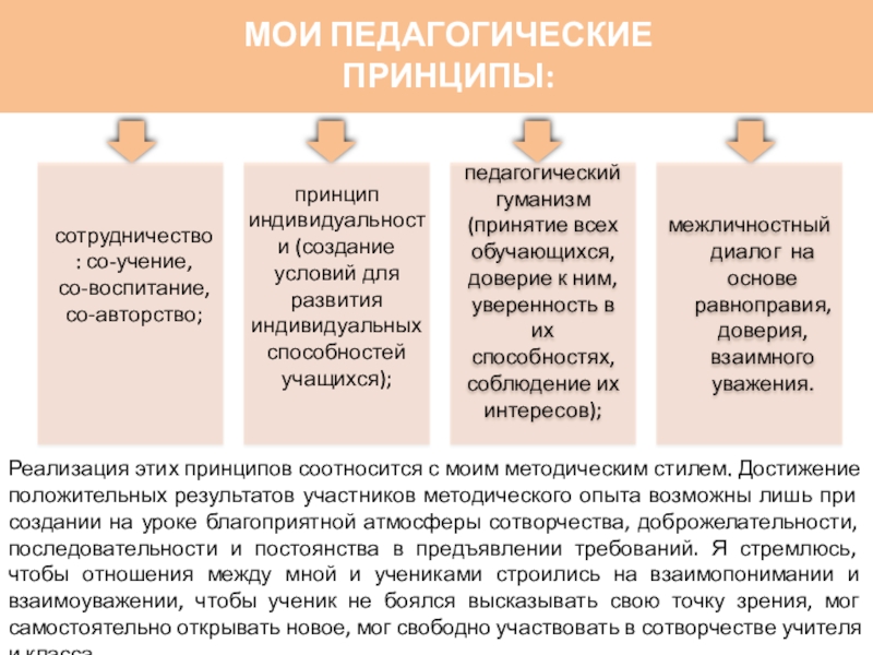 Реализация этих принципов соотносится с моим методическим стилем. Достижение положительных результатов участников методического опыта возможны лишь при создании на уроке благоприятной атмосферы сотворчества, доброжелательности, последовательности и постоянства в предъявлении требований. Я стремлюсь, чтобы отношения между мной и учениками строились на взаимопонимании и взаимоуважении, чтобы ученик не боялся высказывать свою точку зрения, мог самостоятельно открывать новое, мог свободно участвовать в сотворчестве учителя и класса.